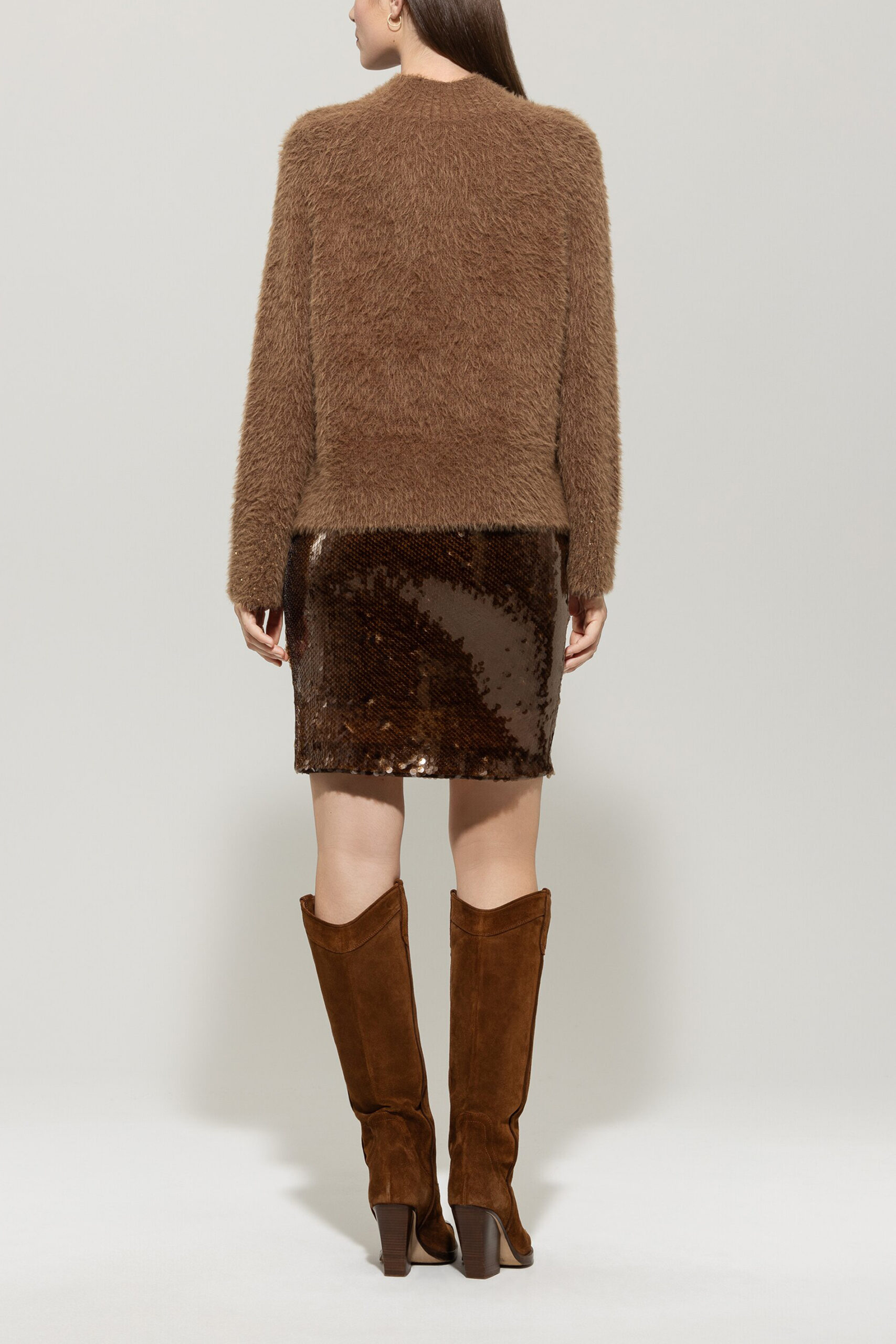 Pullover in extravaganter Fake-Fur-Optik aus weichem Woll-Mix mit glitzerndem Paillettenbesatz am Ärmelsaum. Der Rundhalsausschnitt und der seitlich geschlitzte Saum sind mit einem breiten Rippstrick-Bund eingefasst.