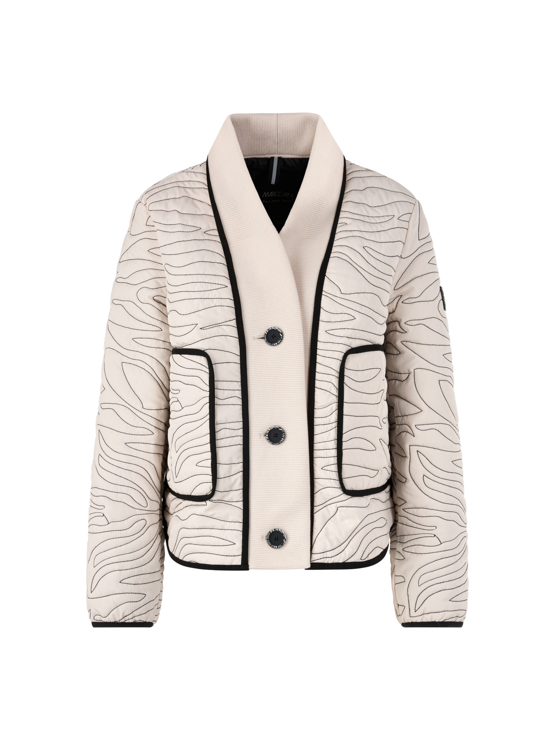 Kurze Steppjacke mit Strick-Detail|Die besondere, wellenförmige Steppung mit schwarzen Nähten macht diese Jacke zu einem echten Hingucker. Sie ist etwas kürzer geschnitten und besitzt eine kastige Form. Seitlich befinden sich praktische Taschen mit Reißverschluss. Zu verschließend ist die Jacke mit Knöpfen, an denen ein dezentes Zebra-Design angebracht ist. Der Kragen ist durchgängig aus Rippstrick gefertigt. Die Jacke ist gefüttert.|Weite Form|Mit Knöpfen|Wellenförmige Steppung|Seitliche Taschen|Das Model ist 179 cm groß und trägt N3/38.